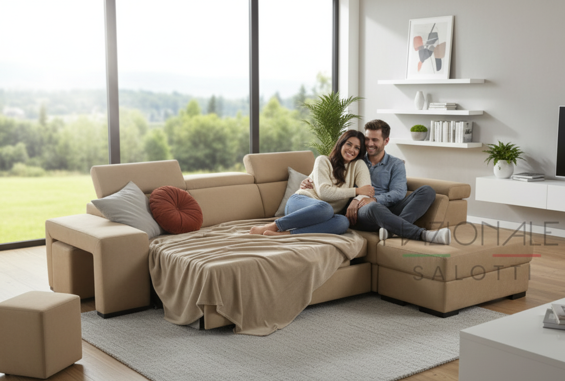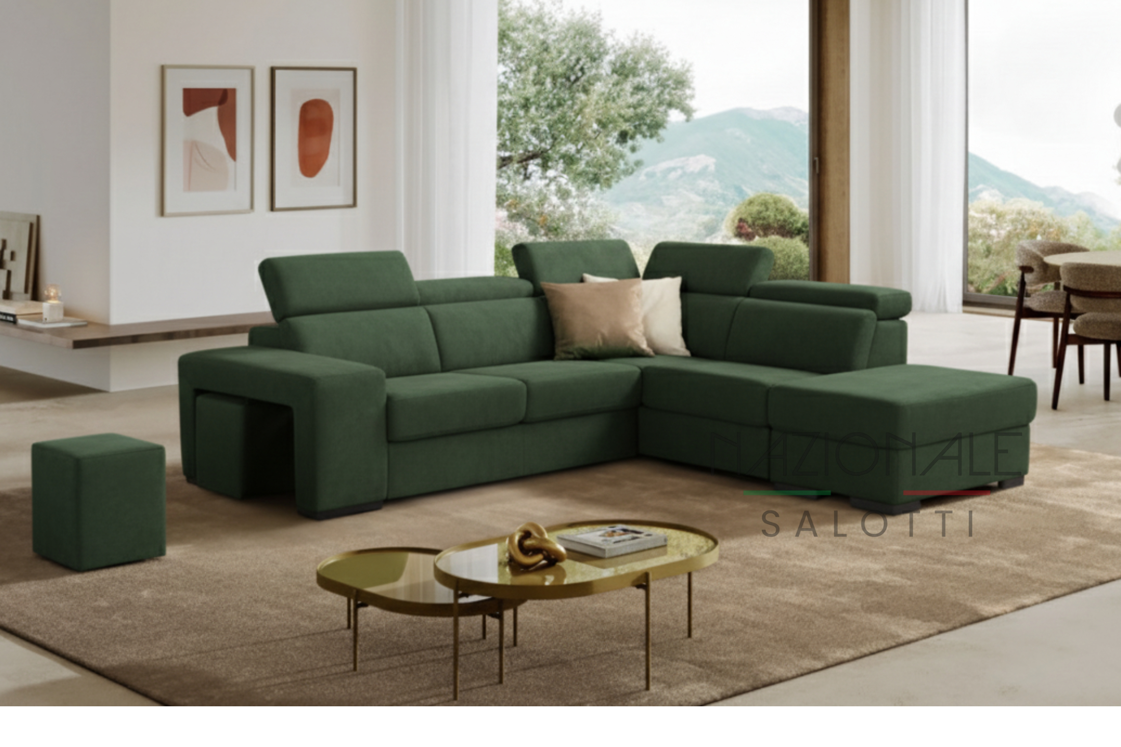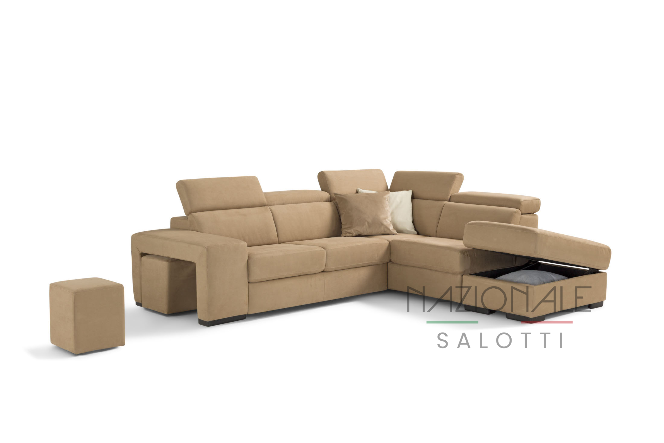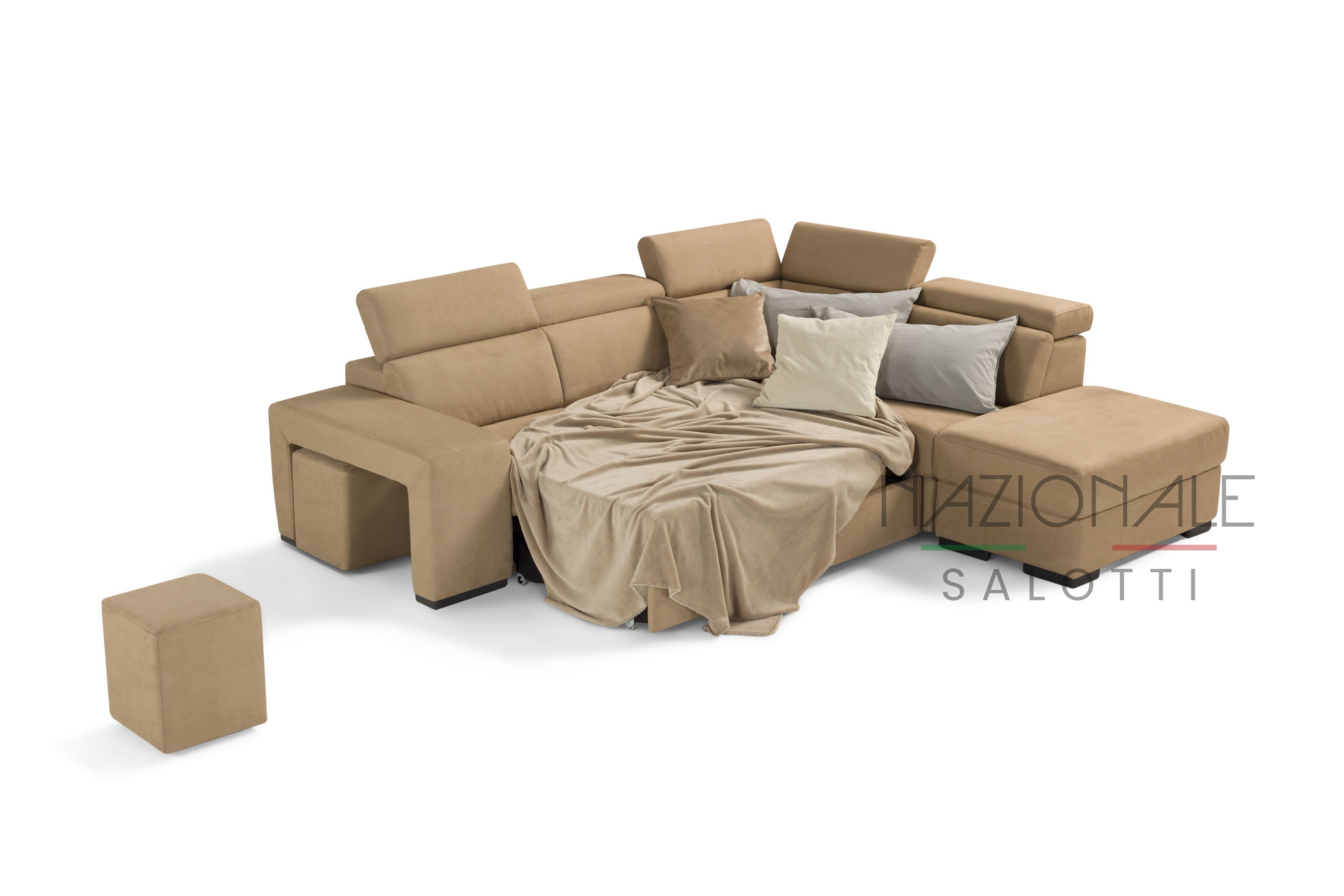 Appare come un tradizionale divano angolare, ma, al suo interno nasconde un pouf estraibile che sollevandosi si allinea alle sedute creando un piano di riposo di grandi dimensioni per il benessere di tutta la famiglia.