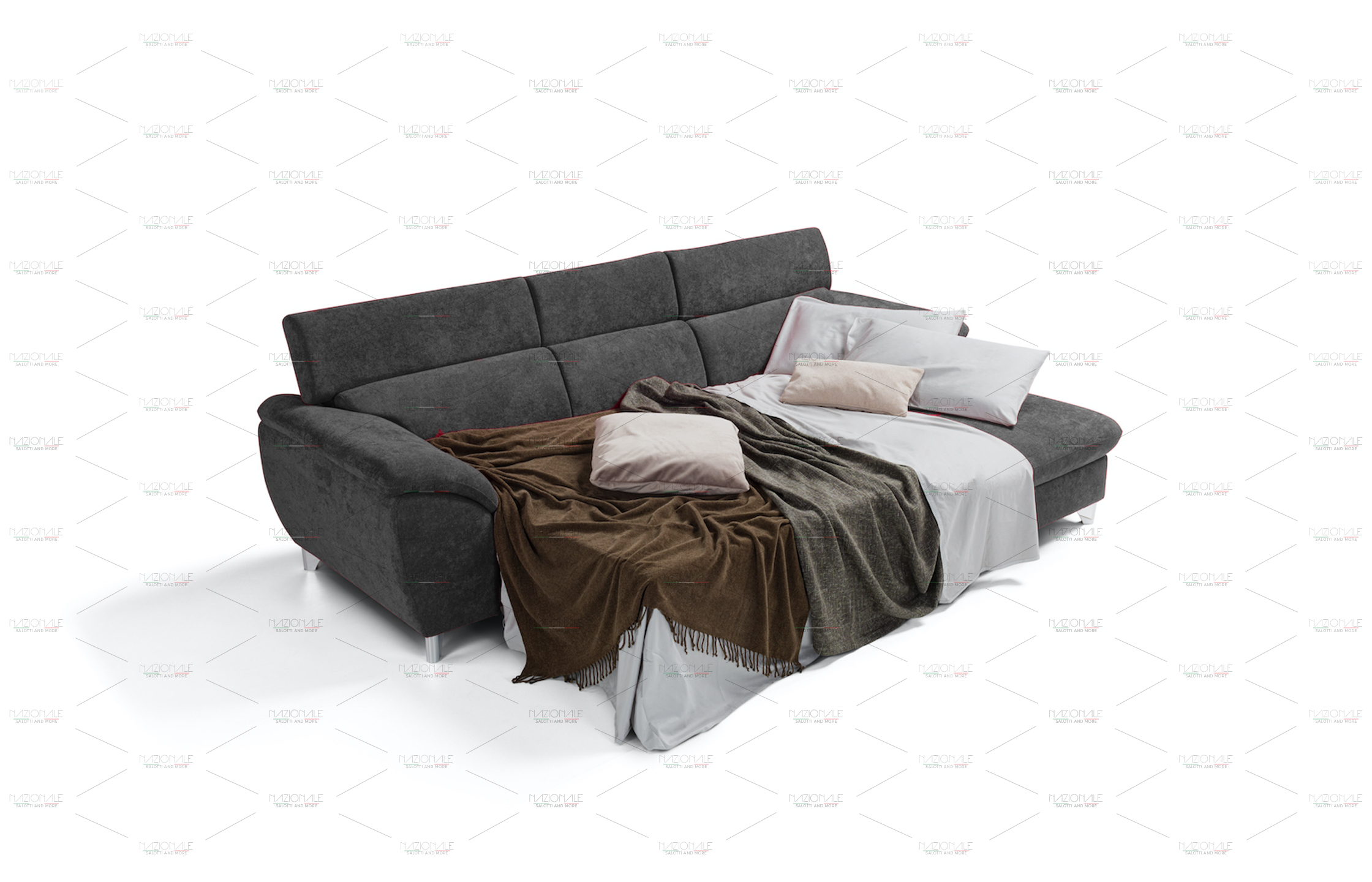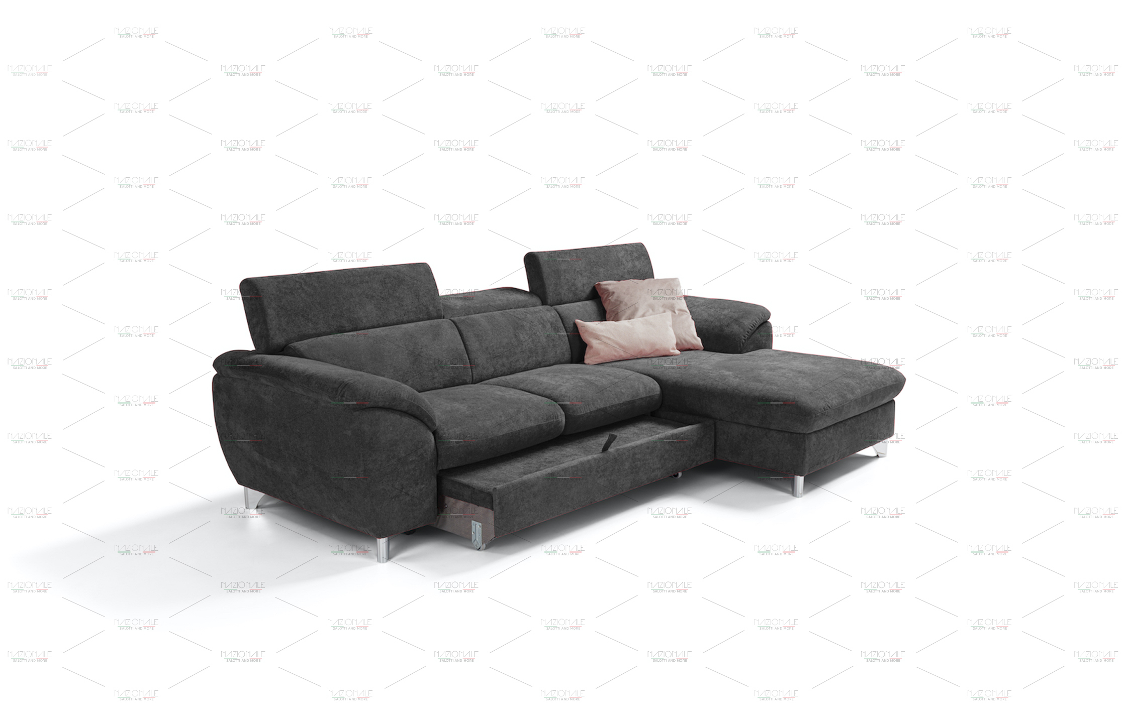 Il divano letto modello CALABRIA con chaise longue con pouf estraibile, che, all'occorrenza diventa un pratico piano di riposo, è un divano dalle linee moderne impreziosite da eleganti braccioli dalle forme sinuose