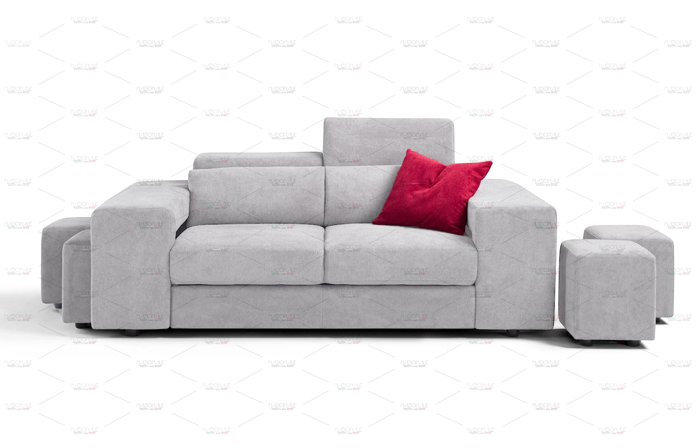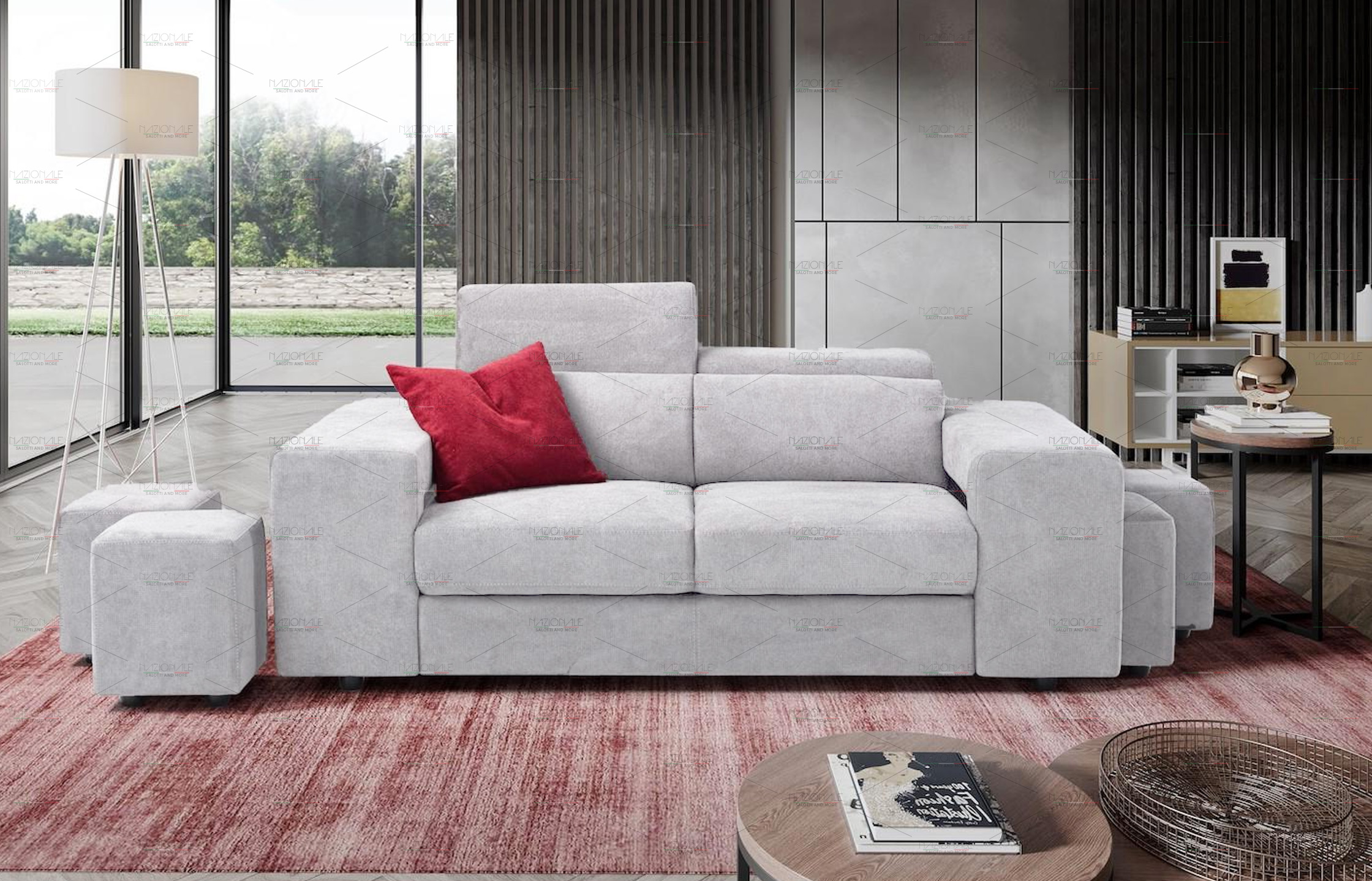 Il modello BRERA è un divano dalla forma pulita e proporzionata. Un salotto moderno grazie anche ai suoi imponenti e squadrati braccioli che, nascondo 4 piccoli e comodi pouf.