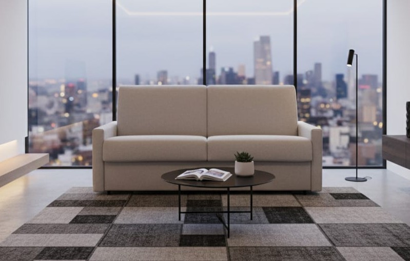 Ideale per qualsiasi tipo di ambiente, questo divano, si trasforma facilmente in un vero e comodo letto con un unico movimento, senza la necessita' di rimuovere i cuscini della seduta.