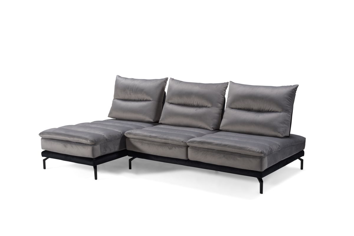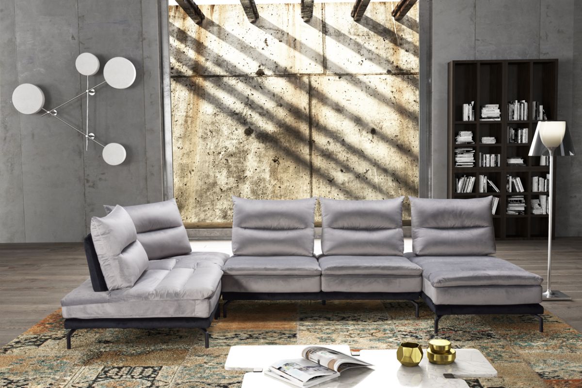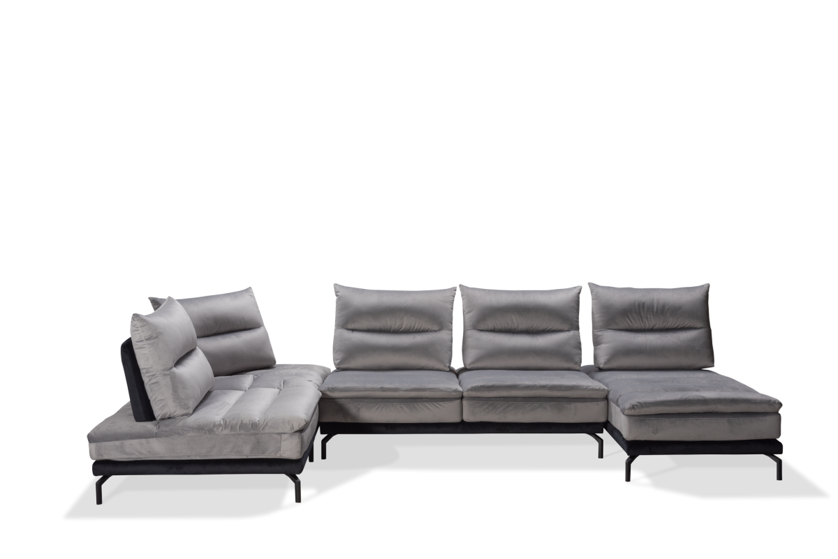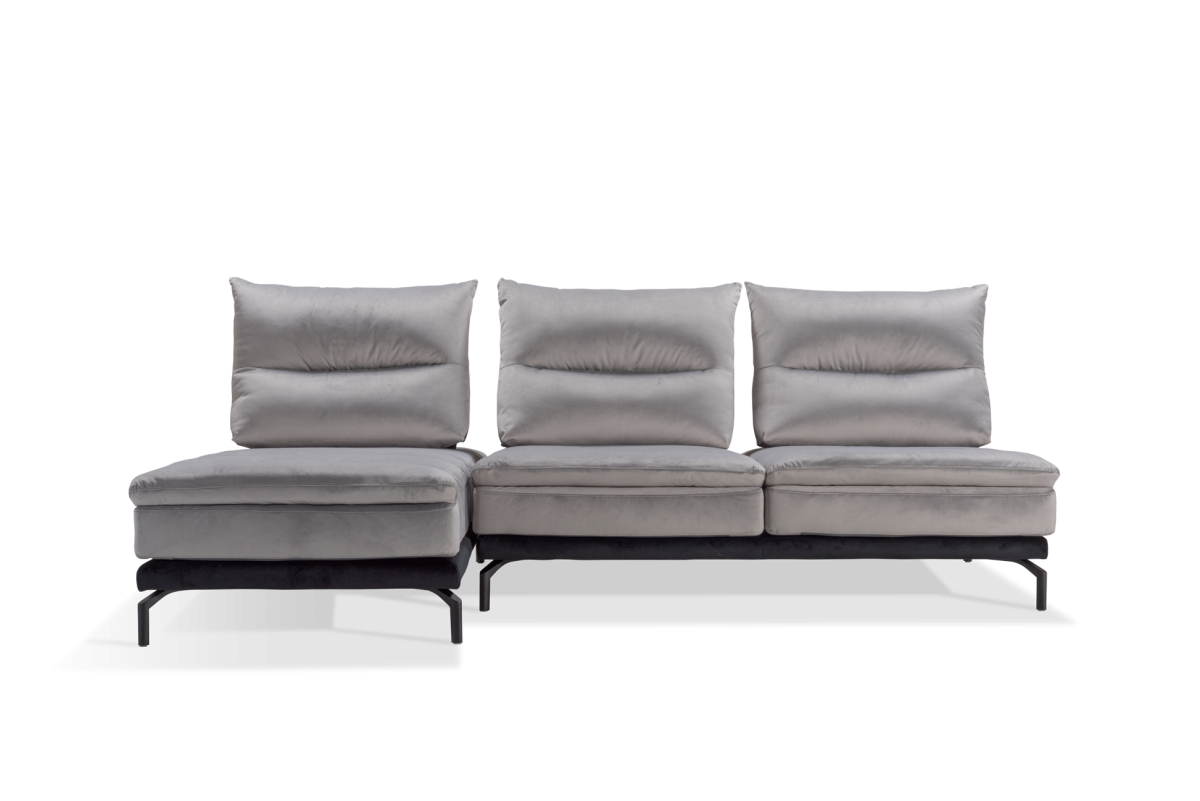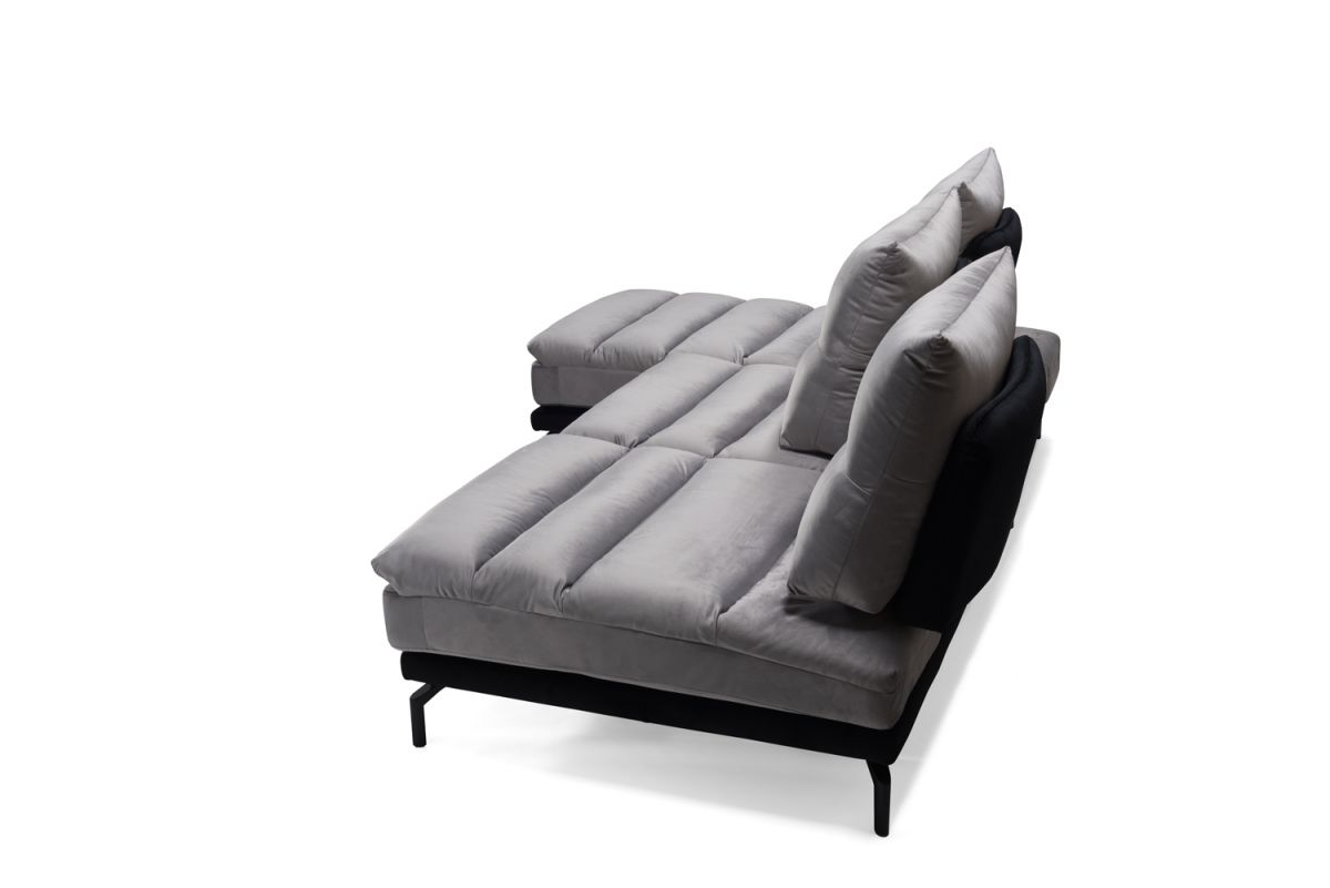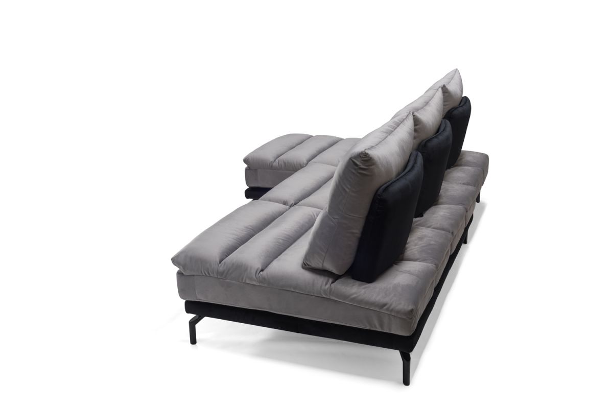 Un comodo sistema caratterizzato da schienale e sedute sfoderabili, oltre a vantare la presenza di spalliere con meccanismo traslante basculante che permettono di aumentare la profondità della seduta, per godere di una estrema comodità! Lo speciale rivestimento in Velluto Mat, in foto nella versione bicolore grigio perla e nero, è completamente lavabile e dona a questo divano modulare un design moderno, arricchito da raffinati piedi in acciaio nero.