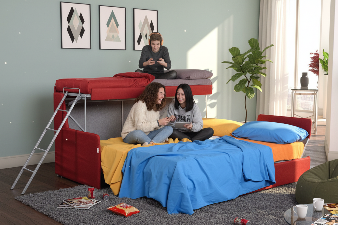 Non rinunciare alla comodità e allo stile per problemi di spazio. Scegli il Divano Letto a Castello Triplo: la tua soluzione 3-in-1 per dormire e arredare.