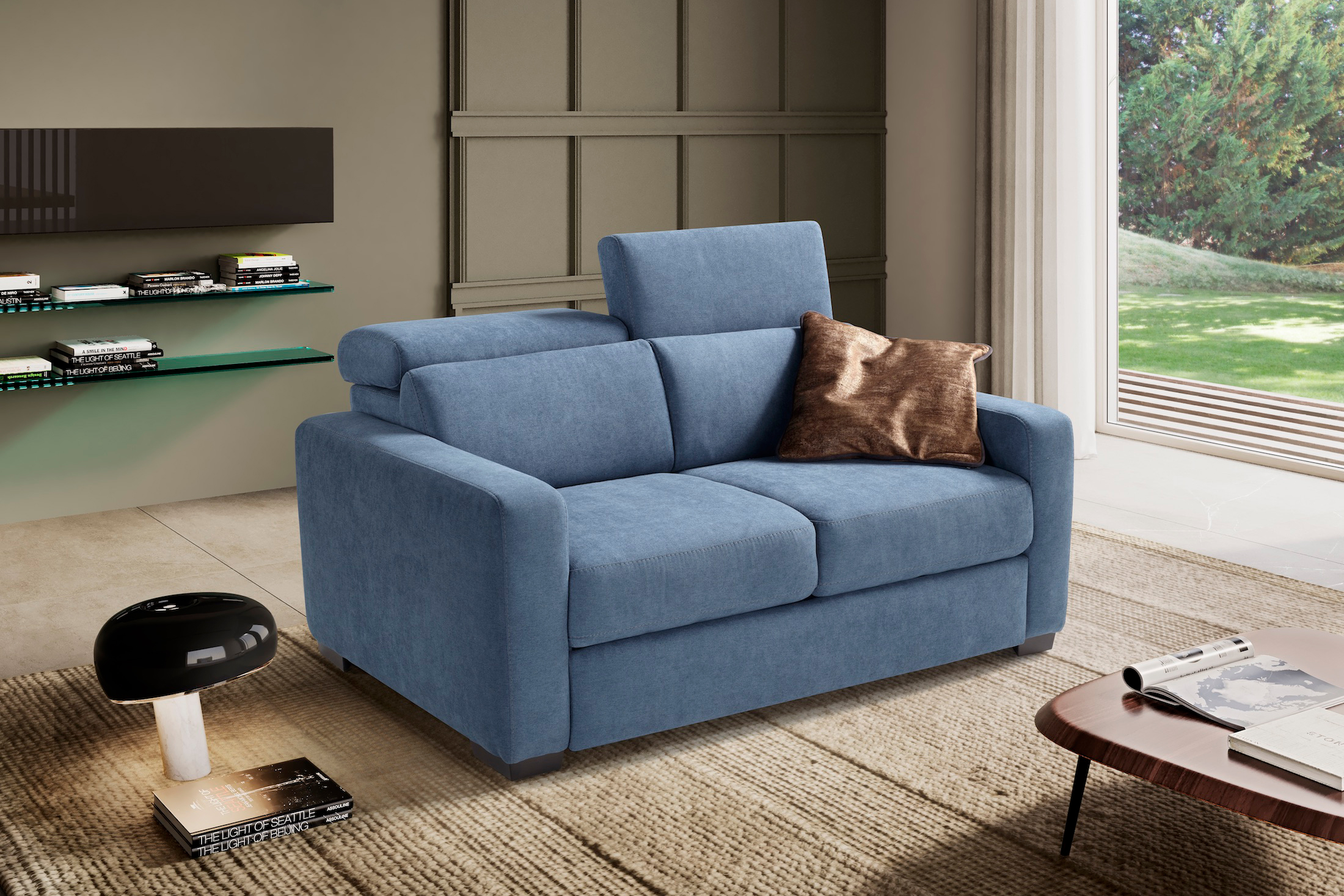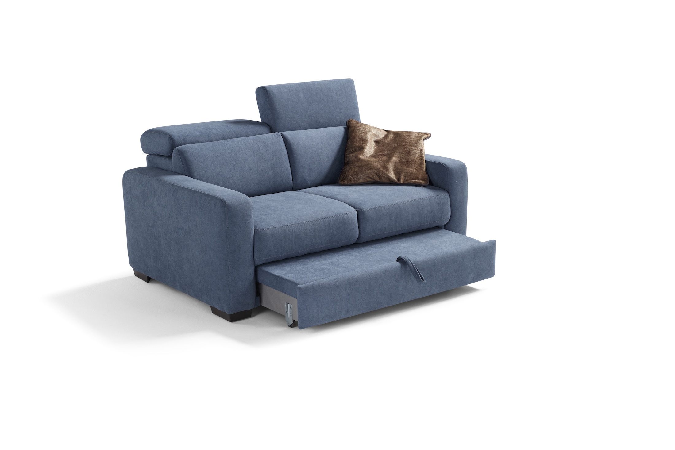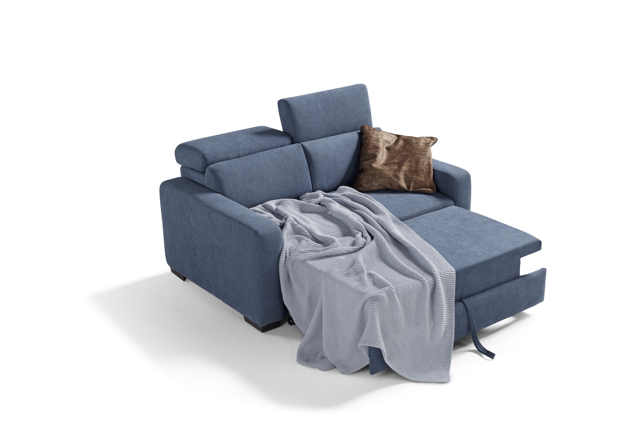 Con le sue dimensioni contenute (solo 150 cm di larghezza), è dotato di un pratico piano di riposo con panca estraibile poggiapiedi e 2 poggiatesta recliner regolabili in 7 diverse posizioni.