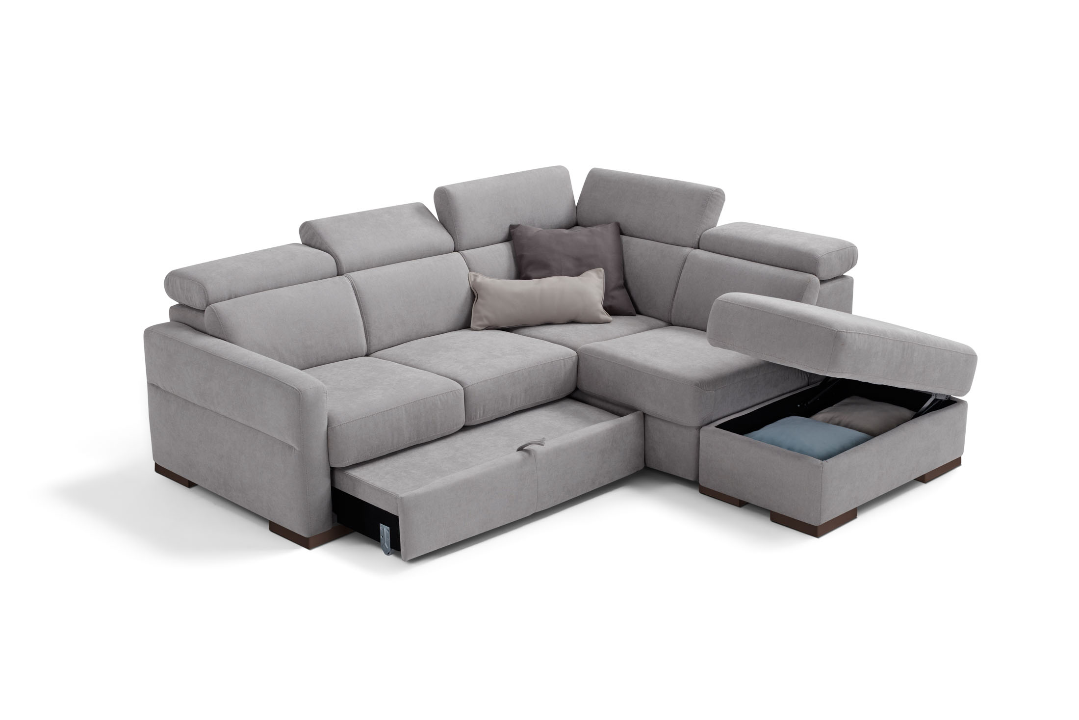 Con le sue dimensioni contenute (solo 230 cm di larghezza), è dotato comunque di molteplici comfort, come un pratico piano di riposo con panca estraibile poggiapiedi, 5 poggiatesta recliner regolabili in 7 diverse posizioni ed un pouf contenitore indipendente.
