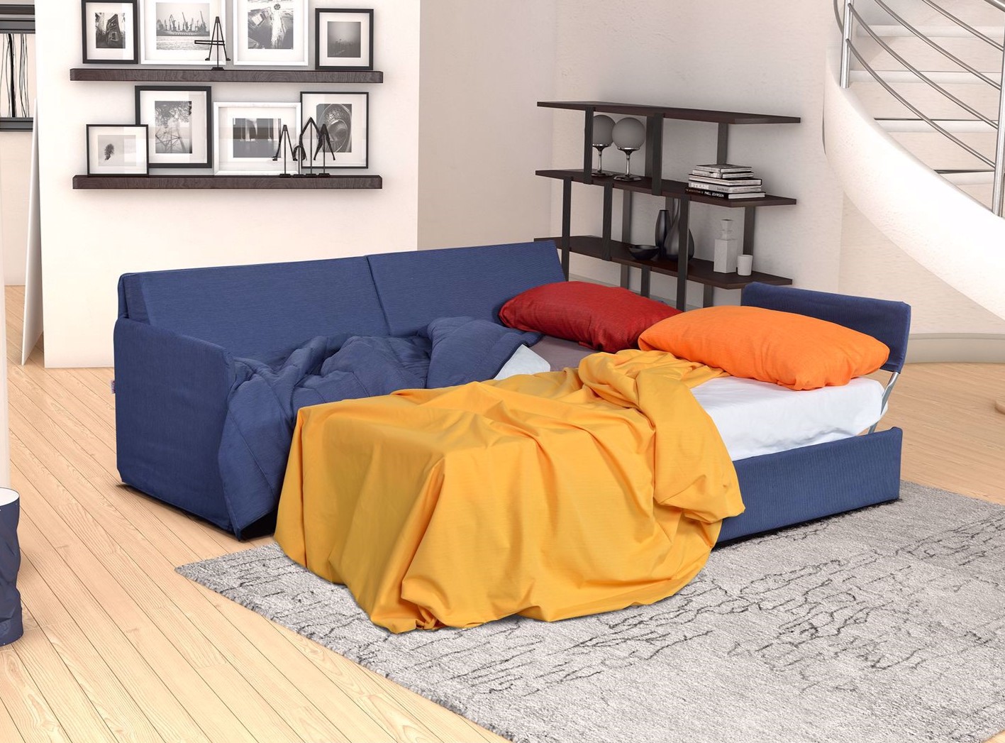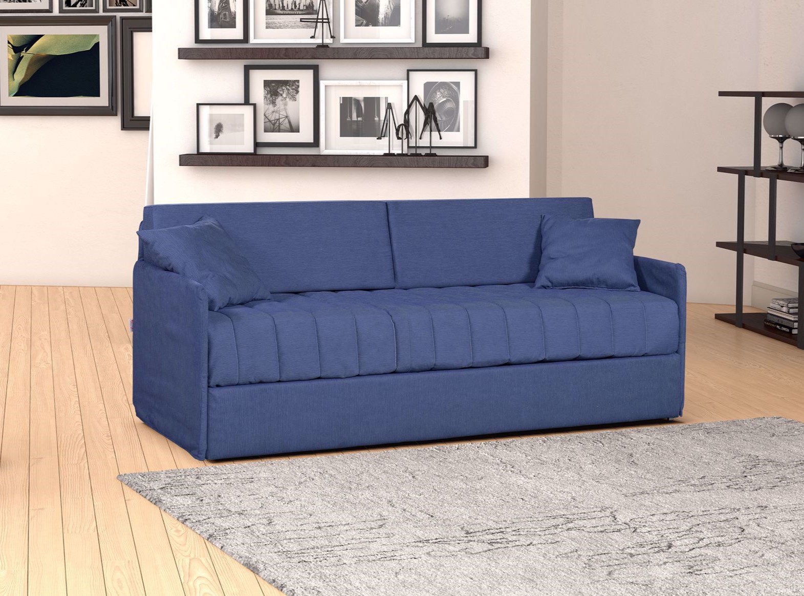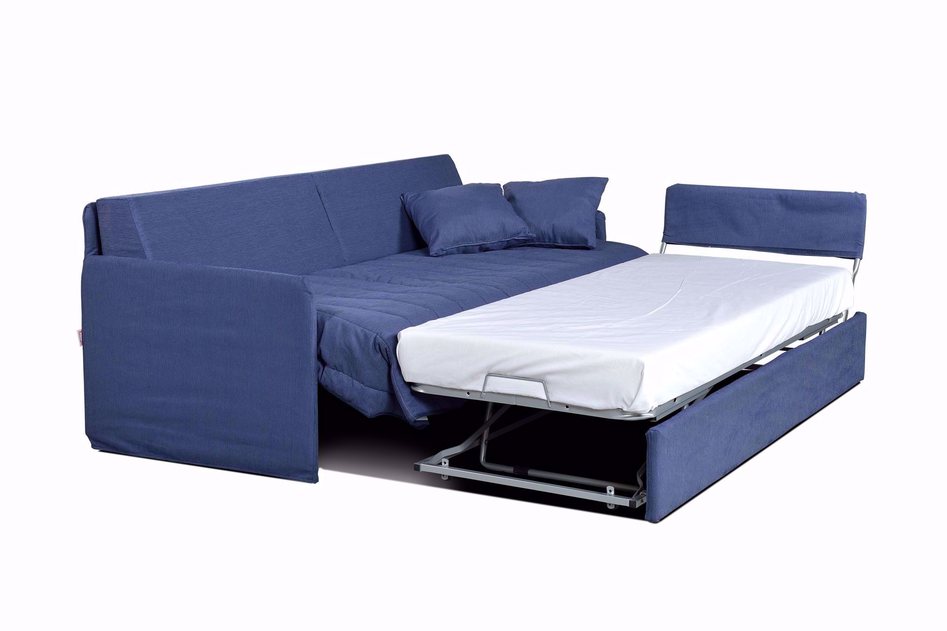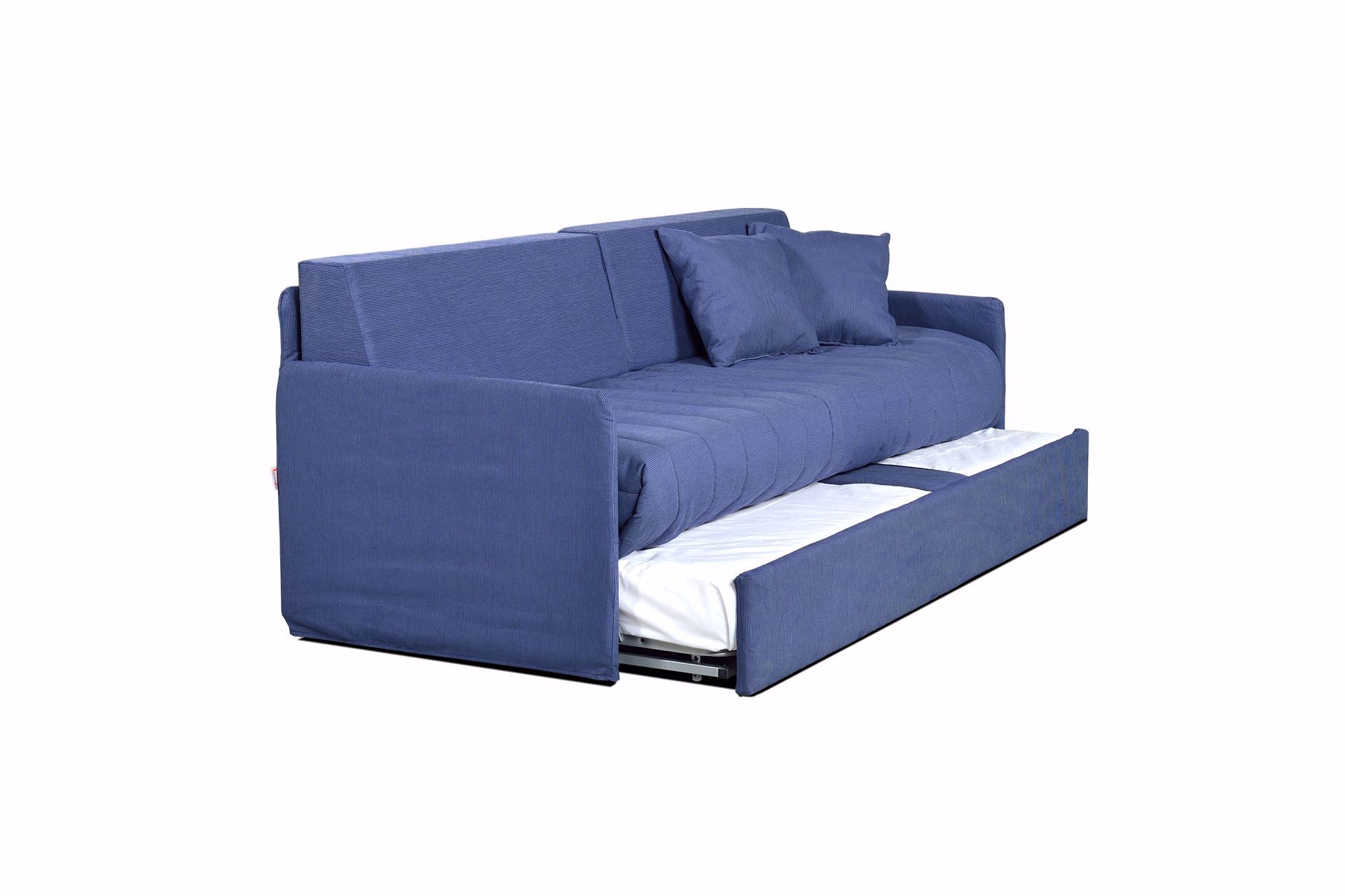 Ecco un divano letto adatto per le camerette dei bambini o dei ragazzi ideale per stare sotto ad armadi a ponte. Barcellona è dotato di un secondo letto estraibile con sistema di apertura manuale o automatico che tramite l’azionamento dello schienale consente di alzare il letto sullo stesso piano del primo letto o di essere aperto in altre zone della casa.