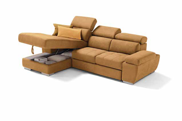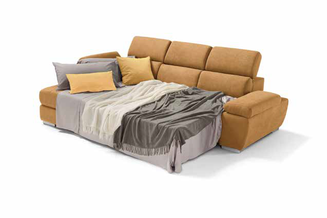 Appare come un tradizionale divano con chaise longue, ma, al suo interno nasconde un pouf estraibile che sollevandosi si allinea alle sedute creando un piano di riposo di grandi dimensioni per il benessere di tutta la famiglia.