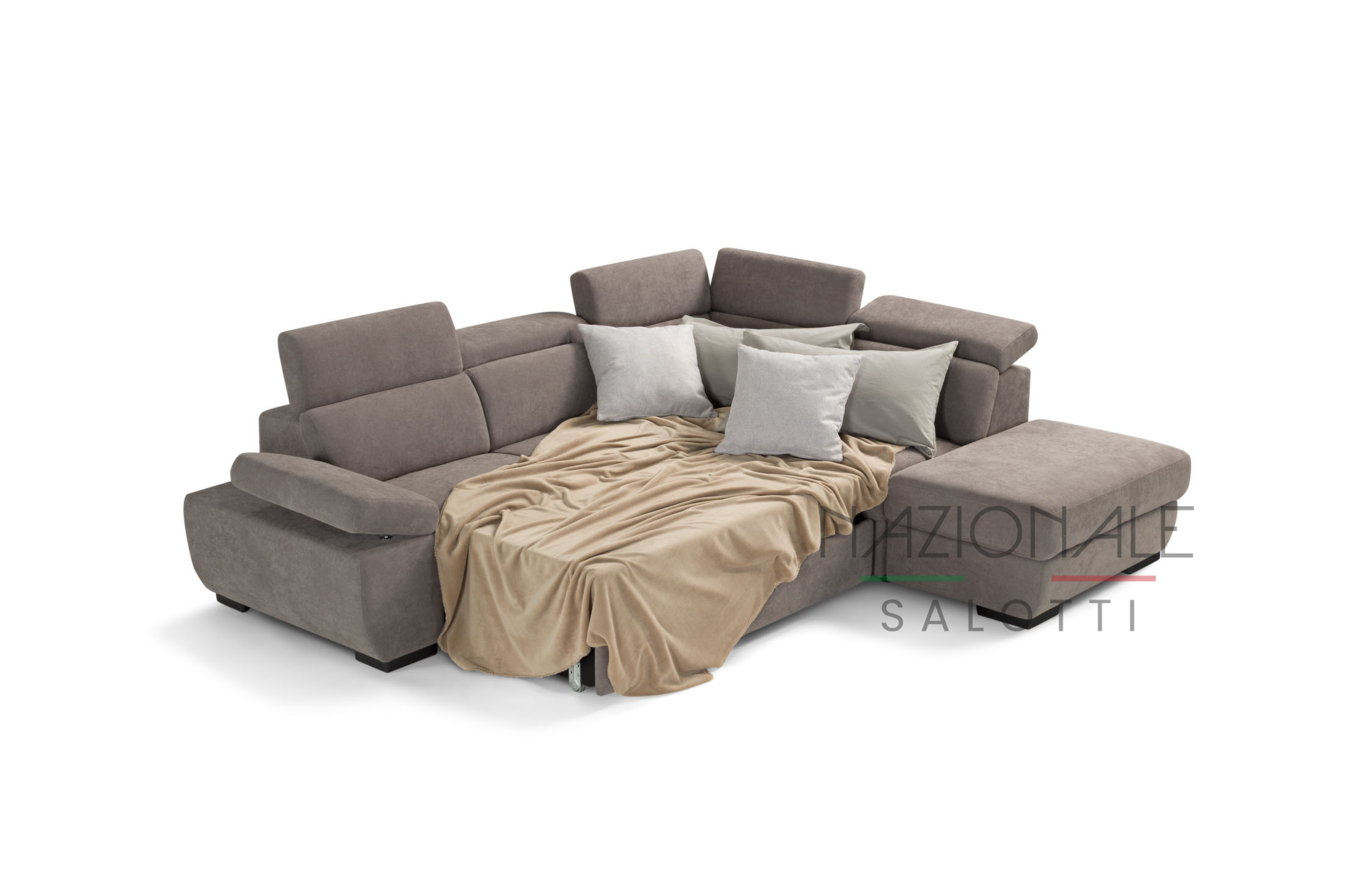 Il divano letto angolare modello SICILIA con pouf estraibile, che, all'occorrenza diventa un pratico piano di riposo, è un divano dalle linee moderne, munito anche di un comodo pouf contenitore salva spazio indipendente.