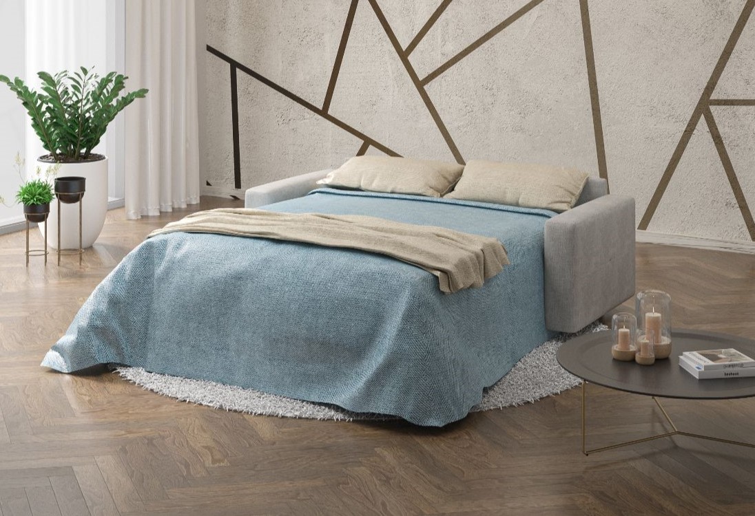Il divano letto a ribalta modello "Mare" con le sue linee essenziali, nasconde un pratico letto matrimoniale alla francese largo 140 cm.